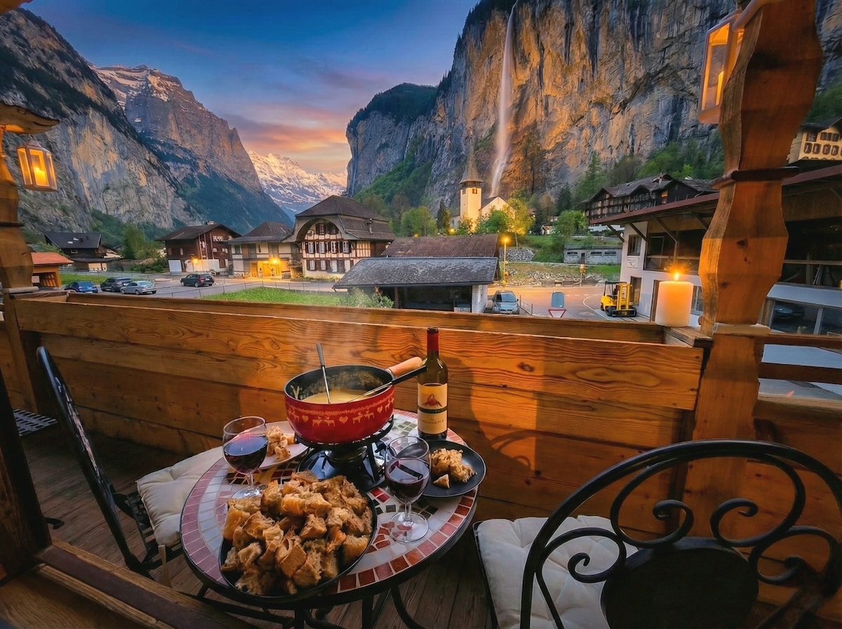 小木屋「Wasserfallhüsli」位於勞特布魯南的中心,可能是勞特布魯南最壯觀的景觀。 從陽臺上,您可以俯瞰巨大而世界著名的斯塔布巴赫瀑布。 除了Staubbach瀑布外,還可以看到另外五條瀑布。 斯塔布巴赫瀑布前面就有教堂。