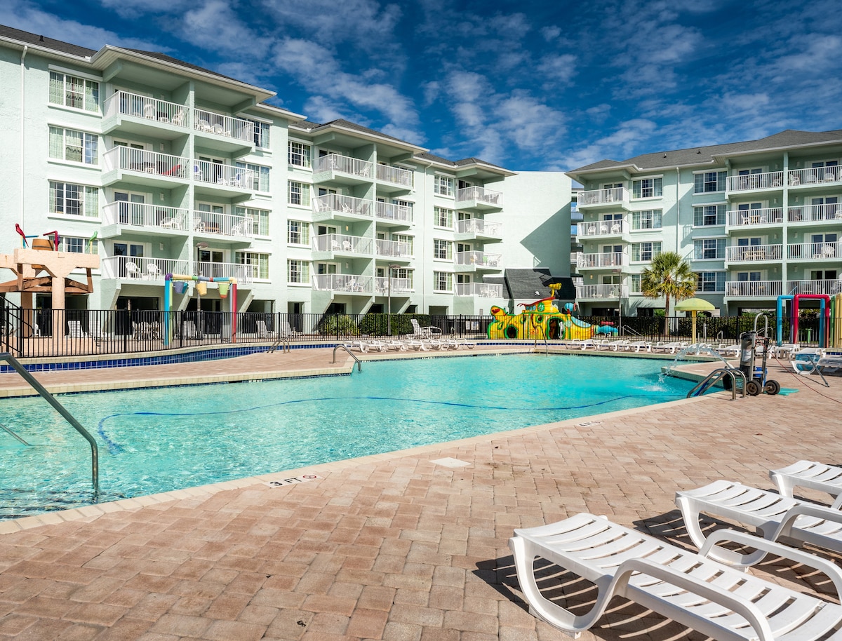 這間美麗的1BR、1BA海濱套房,可供5人入住,非常寬敞。1樓有私人陽臺和迷人的海濱景觀。 1間臥室配有加大雙人牀,客廳配有下拉式墨菲和沙發牀。 廚房和浴室都有花崗巖檯面,有大型淋浴間和全效廚房。 2臺電視、WiFi、熨鬥、吹風機、2個室內/室外泳池、2個按摩浴缸的室內/室外、懶人河、草坪椅/雨傘,步行即可抵達海灘。 詢問我們提供的蜜月/週年紀念套餐。