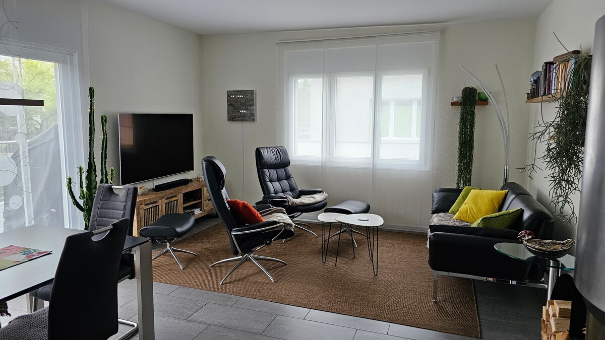 130平方米的明亮公寓,距離火車站兩分鐘,距離湖泊五分鐘 一間設有屏風的特大床睡房,以及一間設有標準雙人床的睡房 設有電影區和雙人沙發床的客廳 配備Siemens的現代廚房和可容納六人的飯廳 洗衣機和專用健身區 開車前來的旅人可購買每日停車卡,價格為7瑞士法郎。