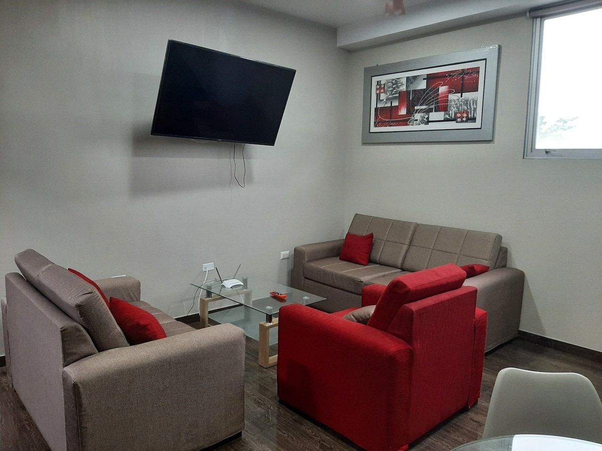 Apartamento de estreno, tranquilo y espacioso con wifi de fibra óptica (alta velocidad). Gran jardín exterior con áreas comunes para trabajar o descansar. Habitación con cama de 2 plazas y sofá cama. Posible agregar una cama de plaza y media. Mueble para trabajar y closet espacioso. Baño privado con excelente presión de agua, cocina amplia equipada con frigobar, cubiertos, platos y ollas. Mesa de comedor. A 10 min del centro de la ciudad y aeropuerto en transporte público (motocarro o taxi).
