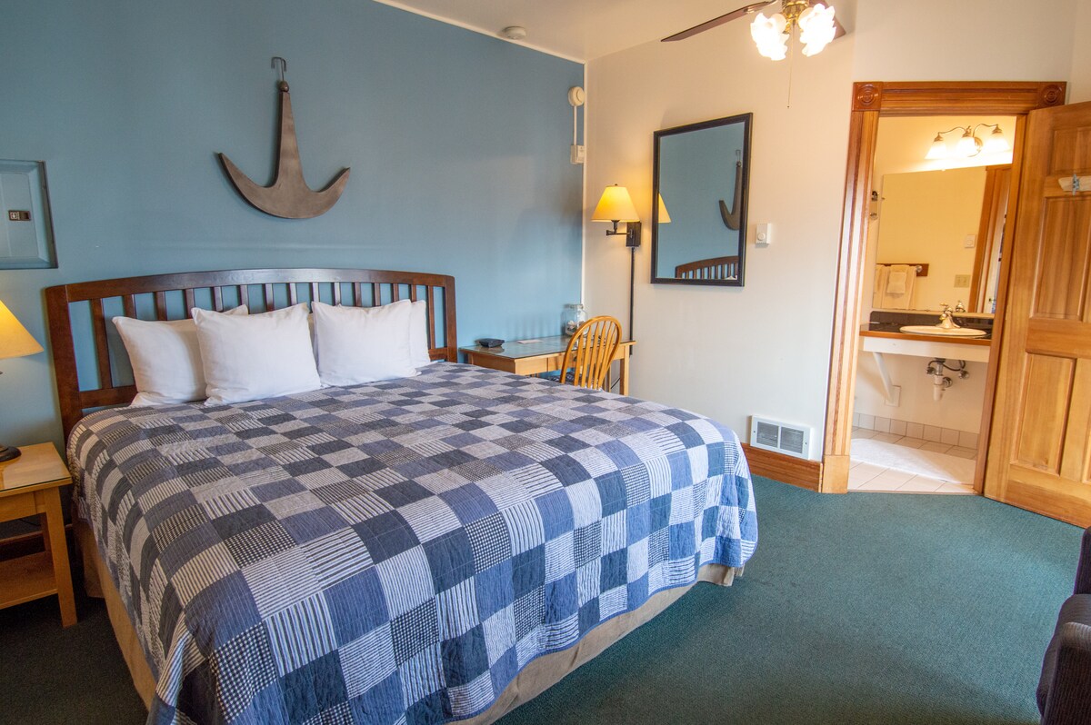 在我們的海港精品酒店中,醒來時可欣賞湯森港市中心的景色! 這間二樓房間提供一張大床、全套獨立浴室、高清電視、小冰箱、微波爐、房內咖啡/茶服務。 提供免費Wi-Fi和現場泊車位。 吹風機、熨斗和熨衣板。 Swan位於湯森港(Port Townsend)文化和歷史區的中心,毗鄰Point Hudson Marina ,距離西北海事中心的教育計劃僅幾步之遙。