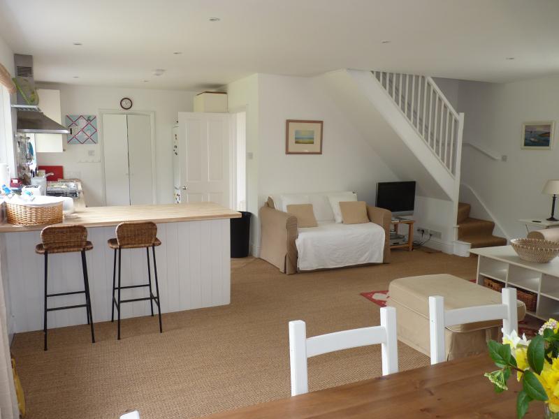 在這間美麗的公寓享受美妙的假期,品味高雅地翻新,融合了復古和現代家具。 該空間包括一間配有陽臺的加大雙人牀主臥室、配有雙人牀的第二間臥室、新廚房、開放式休息室/餐桌和配有大型步入式淋浴間的浴室。 有免費WiFi、Netflix和停車許可證。它位於利明頓(Lymington)的黃金地段,位於碼頭旁邊的鵝卵石碼頭山(Quay Hill)。