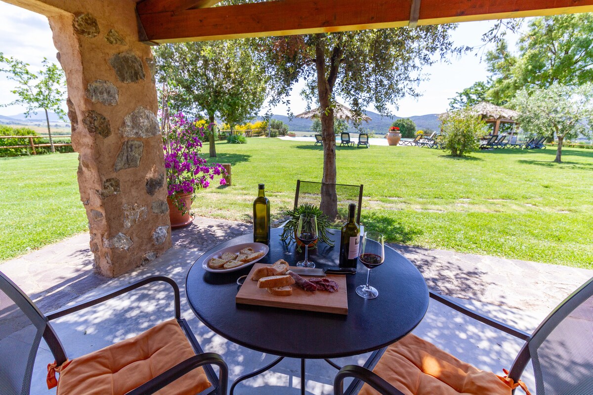In the Maremma countryside, private panoramic swimming pool, with a 360° !!! View of the Argentario, the island of Giglio and the medieval village. Spectacular sunsets to admire! The villa is on one floor, characterized by exposed wooden beams, verandas, handmade terracotta floors, elegant minimal furniture. It can accommodate up to 6 people. Park of 2 hectares of garden with olive grove and centuries-old oaks. Located 5 minutes from the beautiful village of Pereta.