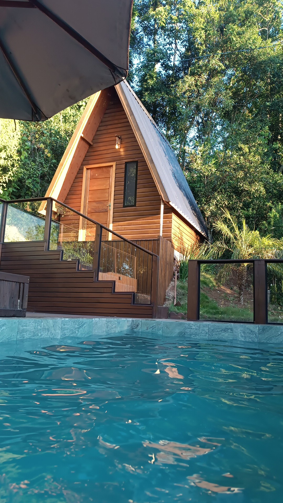 Cabana privativa em Chapecó-SC, cercada por paisagismo. Banheira de hidromassagem, lareira, piscina e churrasqueira para momentos de descanso em casal ou com a família. Pets bem-vindos.