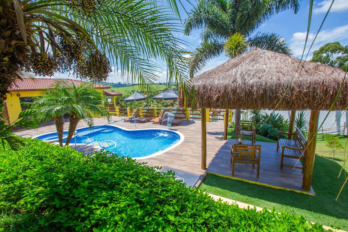 Relax at this unique and tranquil getaway. Our home is located in the countryside approximately an hour from São Paulo, between Itatiba and Bragança Paulista. Nestled among the hills in the middle of a farm. The gated condominium is the perfect get away from the busy city. You will be staying in the modern brick chalet, pool & large yard. Upstairs: full gourmet kitchen & dining area with two bathrooms & one small bedroom. Downstairs: 2 private suites & living room with sofa bed & smart TV.
