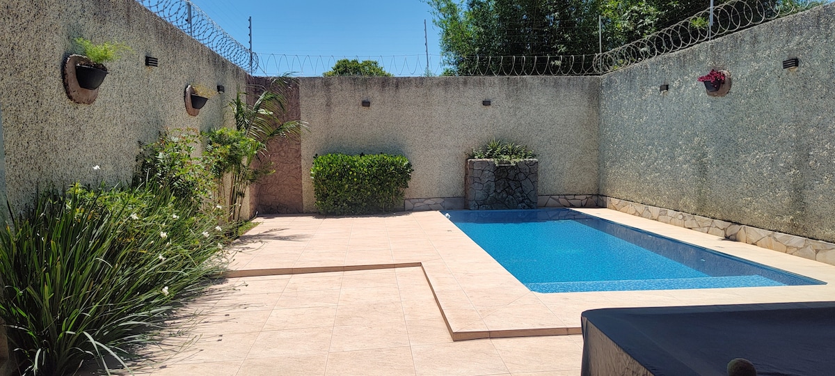 在選擇我們的住宿時,您將進入我們在Salto市美麗的Chácara所在的封閉式公寓內,您將在後面的房子/edicula ,在那裡您有燒烤、設備齊全的廚房、餐廳、臥室/房間、臥室和2間浴室、內部和外部面向泳池和部分草坪,車庫與Angela (房東)共用,他坐在土地前面的主屋中,我們重視您的隱私