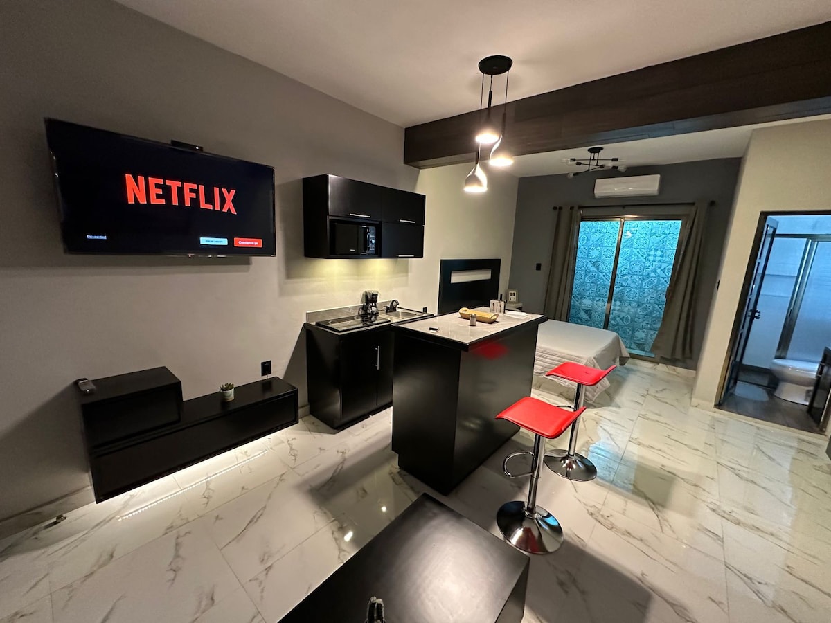 非常適合2人尋求舒適、寧靜和休息。 私人迷你公寓,位於優越、旅遊和安全的區域。 設施:廚房、雙人牀、獨立浴室、空調、服務露臺、SmarTV、Netflix、WIFI和室內停車場。 步行5分鐘即可抵達Plaza Valle、Cinepolis、Casa Vegas、Mountain Slide、Dragons Nest。 Planetarium, State Art Museum, Ojo de Agua, Coliseo LA CONCORDIA. 附近有很多公共交通路線。