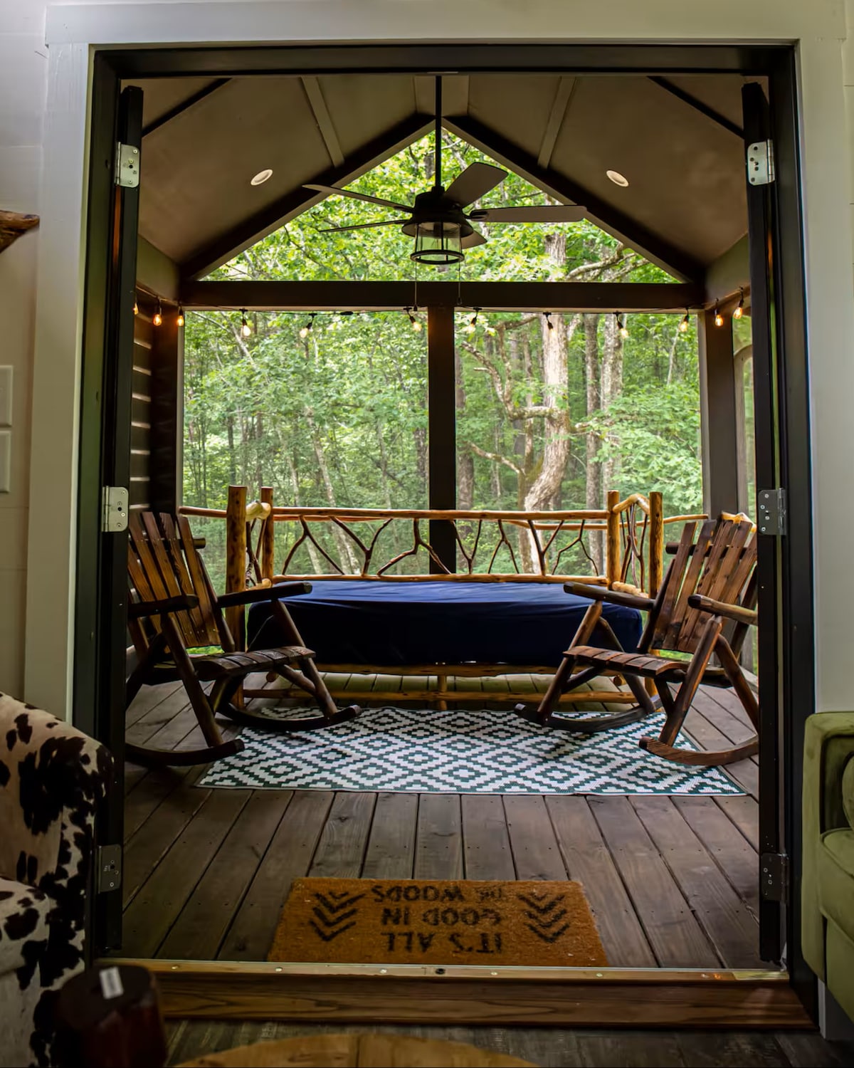 The Crooked Tree Cabin – a tranquil creekside getaway at at Blueberry Falls Farm, a u-pick blueberry haven in Mentone, AL! Relax in the private hot tub on the screened-in porch, listen to the waterfall, or nap on the cozy sleeping porch. ➤ Hot Tub ➤ Screened-In Sleeping Porch ➤ Wet Weather Creek, Pond & Waterfall ➤ Fire Pit ➤ Community Game Room: PS4, Foosball, Pac-Man & Crafts ➤ Kid & Pet Friendly Where nature, comfort, and a touch of playfulness come together.
