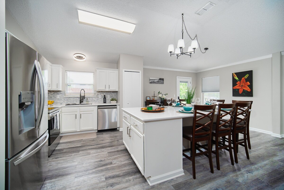 入住這間位處中心地段的房源,全家到哪都方便。 距離主要購物和餐廳僅幾分鐘路程,距離傑克遜維爾海灘僅15分鐘路程。 距離TIAA Bank Field球場僅10分鐘,可觀看美洲虎隊或享受您最喜愛的活動。 房源設有風景優美的後院,可欣賞湖景。您可以坐在釣魚甲板上或在家庭用餐甲板上放鬆。 如果你喜歡划獨木舟,那就去吧。 然後回來與家人或朋友在火坑旁享受美好的夜晚。