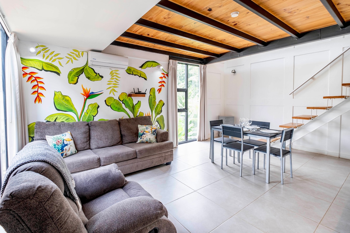 歡迎來到熱帶海濱綠洲! 此空間位於Macaws Ocean Club -一個多單位公寓大樓,配有泳池和24小時保安-但單位本身非常獨特。遠離一切,四周樹木環繞,感覺完全私密。享受全套廚房、大浴室和環繞整套房源的私人露臺。 1分鐘內步行即可抵達海灘!位於Jaco市中心,但遠離所有噪音。