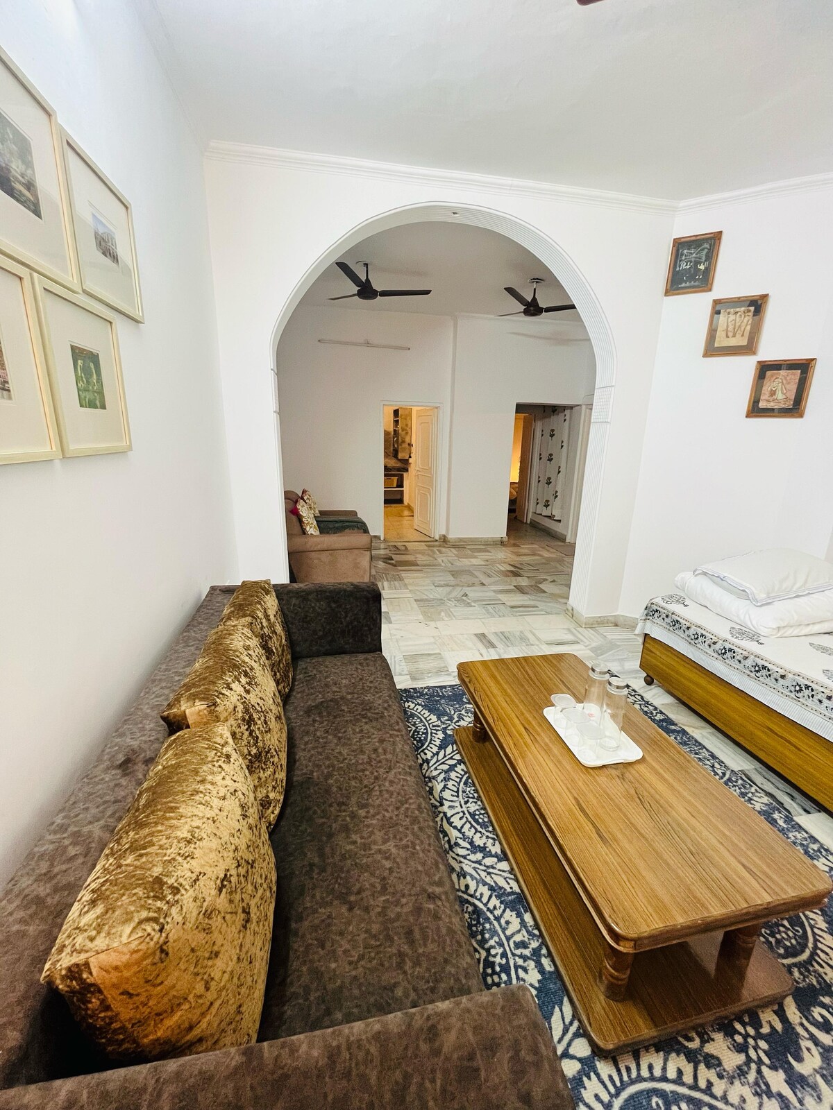 入住這個位於市中心的房源,您的家人將離所有地方都很近。 這是我們的祖屋,大約有250年歷史。我們已經完全翻新了公寓,但保持了它的特色。 這是一間現代化的公寓,配備所有必要的舒適設施,我們的設計旨在保持衛生、清潔和安全。 旅居距離Hawamahal約300米,距離Johri bajar 0米。兩間臥室可容納4位成人,另有一間400平方英尺的客廳和一個廚房