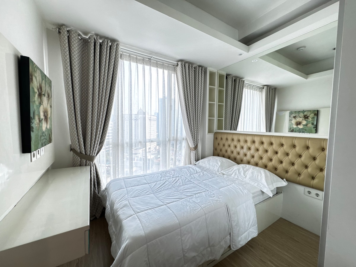 我們的漂亮公寓坐落在雅加達市中心,步行即可抵達商業區最好的地方,如著名的Bunderan HI、Kempinsky Hotel、Plaza Indonesia商場、Grand Indonesia商場、Thamrin City商場和Tanah Abang購物中心。 也在Jendral Sudirman街附近 我們的公寓擁有最好的設施,如大型遊泳池、按摩浴缸、健身房、慢跑道等。 最棒的是,靠近地鐵站和機場火車站( BNI站)。