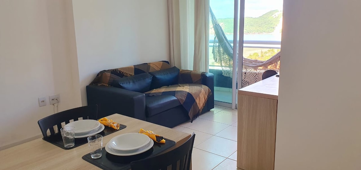 Relaxe neste espaço totalmente CLIMATIZADO.Apartamento único com vista mar, propriedade com acesso a praia e além de uma ótima piscina para adultos e crianças com Decker de madeira que dá visão para o morro do careca , apartamento completo com AR CONDICIONADO NA SALA E NO QUARTO , geladeira , fogão de uma boca por indução, máquina secadora , tv a cabo , wi-fi , estacionamento grátis e rotativo, limpeza diária lugar realmente ótimo para casal passar seu final de semana ou suas férias.