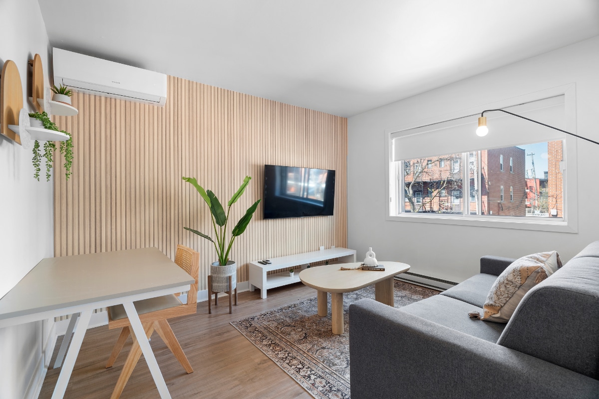 Stylish fully renovated 1 bedroom apartment in the heart of St Hubert shopping Plaza has everything you need . 5 minutes walk to subway Beaubien 15minutes to downtown. Inside is calm and bright with new furniture and fully equipped. -65'' HD smart TV -Free Wi-Fi -AC -One queen bed and one large comfortable sofa (6 feet long) -Full Kitchen -Dedicated workspace -Washer and dryer