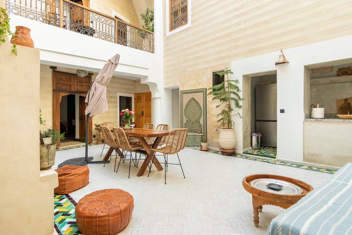 Maison Demi是一間私人住宅,位於一條靠近Place Djemaa el Fna和Souks的安靜街道上! 輕鬆、輕鬆和現代化的摩洛哥人。 迷你庭院住宅,圍繞開放式露台建造。 在馬拉喀什Medina的喧囂中度過一天後,您可以在這裡放鬆一下。 它有2間臥室,一間在露台,一間在一樓(每間都有私人浴室)、沙龍旁邊的露台廚房、一樓的辦公室。 有一個屋頂花園和一個綠色露臺,供您享用 🌴