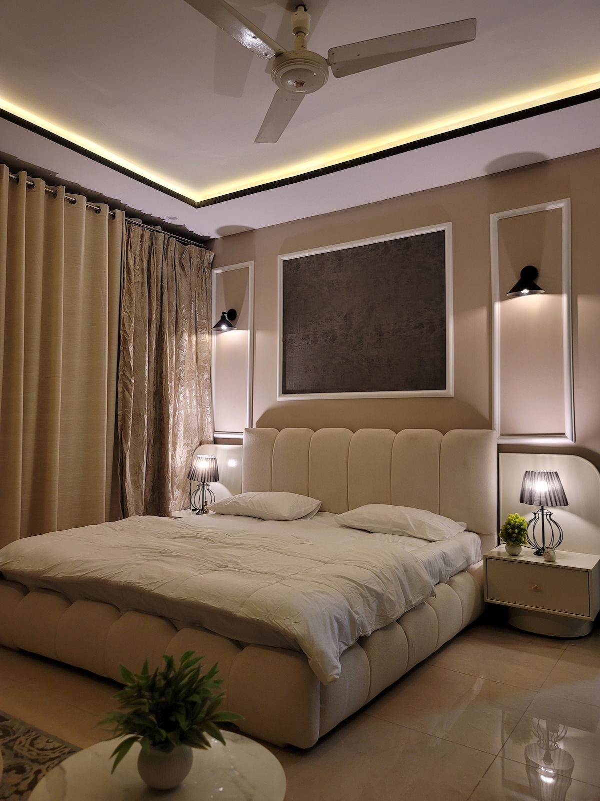This top-floor 2BHK at Zarkon Heights, offers breathtaking city views from a spacious balcony with lounge chairs. The living room features a 55-inch Smart TV, while both bedrooms are beautifully designed with plush comforters, soft linens, and ample storage for a luxurious stay. The fully equipped kitchen includes modern appliances like a toaster and juicer. Located in a secure gated community, just 10 mins from the airport and 15 mins from Blue Area. Perfect blend of comfort and style!