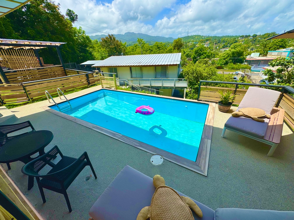 房子周圍環繞著數英畝的熱帶雨林,但距離PR3僅1英里。海景和山景。 10 'x20'鹽水泳池距離您的前門只有幾步之遙。不與其他人共用泳池。 特大主臥室套房 門禁住宅、門禁泳池。 大露臺,配有烤架和充足的座位。 混凝土房屋:安全、可靠、隔音。 全太陽能/無停電! 歡迎家庭和兒童! 距離Luquillo Beach、El Yunque、Carabali Park不到5英里!距離SJU 20英里。 二樓由房東使用