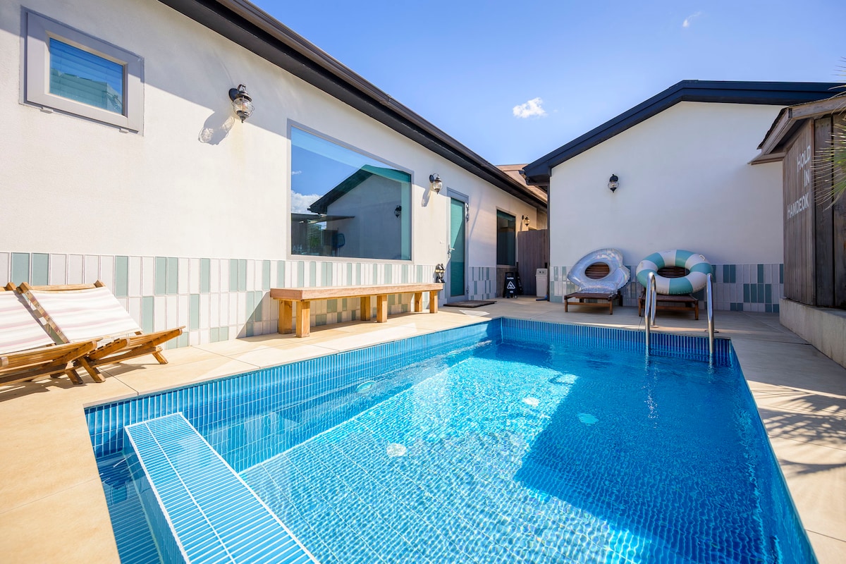 사계절 언제나 이용가능한 개인 단독수영장. -들판 한가운데 조용히 자리한 자연속의 보금자리. -2층 침대에 누워 일출과 일몰 모두 감상. -무료 자쿠지에서 폴딩도어 너머 바다위에 뜬 달빛을 감상하며 하루의 피로를 날리는.. -실내 벽난로 참나무장작 불멍 감성. 독특하면서도 평화로운 이곳에서 편안한 휴식을 즐기세요~♡^^♡~. ♤ 숙소/가이드 문의 에어비앤비에서 문자로 문의주시면 친절하게 안내해드리겠습니다