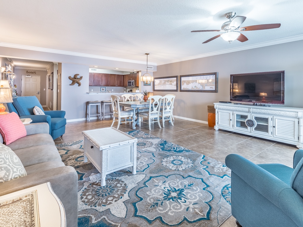 [全新露臺家具] Destin West Resort Gulfside 405 (距離海灘和泳池2分鐘) ~ 1間臥室+ 1間雙層床房,配有2間全功能浴室,可容納6人 ~絕佳海景 ~免費海灘服務: 2張椅子和1把雨傘(季節性: 3/1 - 10/31 ,上午9點-下午5點) ~ 1間加大雙人床臥室,配有獨立浴室 ~ 1間雙層床房(2張雙人床,每張床都有自己的電視),有獨立衛浴 ~ 1張Q尺寸拉出式床 ~攜帶型遊戲床 ~ 4 台智慧電視 ~配備全套廚具的廚房(Keurig和傳統咖啡機)。 ~ 洗衣機/烘乾機