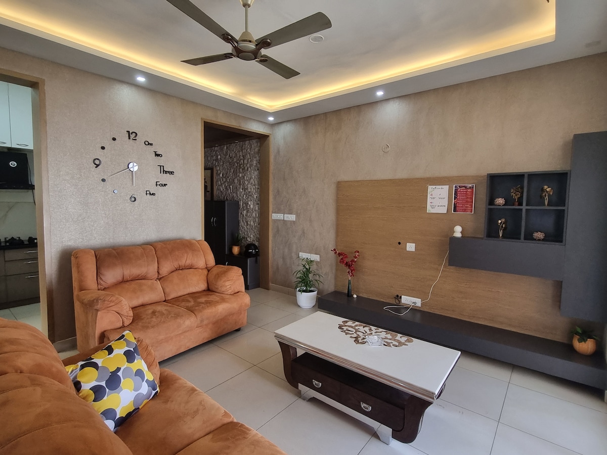 一間寬敞的3臥室公寓,位於11樓,露臺花園,位於Sarjapur Rd和外環路的交叉口,與Double Tree Hilton和Manipal醫院位於同一個校園內,配有日常清潔設施。 非常適合搬到班加羅爾的家庭、在Manipal尋求醫療的家庭、出差的專業人士或尋找輕鬆假期的印度/國際遊客。