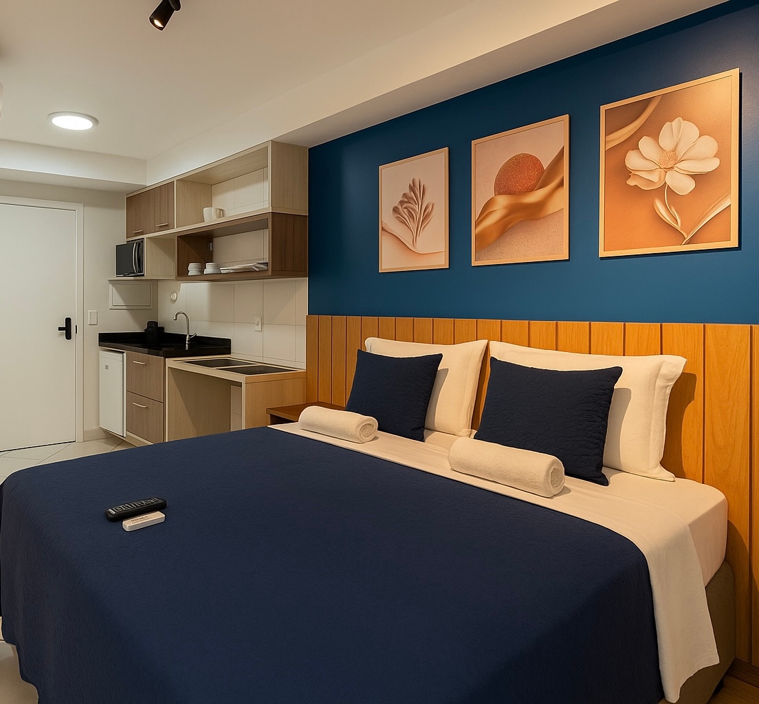 您將靠近一切:餐廳、超市、距離商場3分鐘( 1.4公里)和距離Parque da Uva 3分鐘( 1.3公里) 舒適的🛏️床,配有床單和浴巾。 ❄️ 空調讓您舒適入住。 快速穩定的📶WiFi ,非常適合工作或休閒。 全套🍽️廚房:爐具、微波爐、雪櫃、基本用具。 🏋️♀️ 健身房。 🏊 泳池和桑拿房,讓您放鬆身心。 在接待處享用早☕餐(另付34巴西雷亞爾)。 220v ⚡ 插座 立即💙 預訂,享受難忘的住宿體驗!
