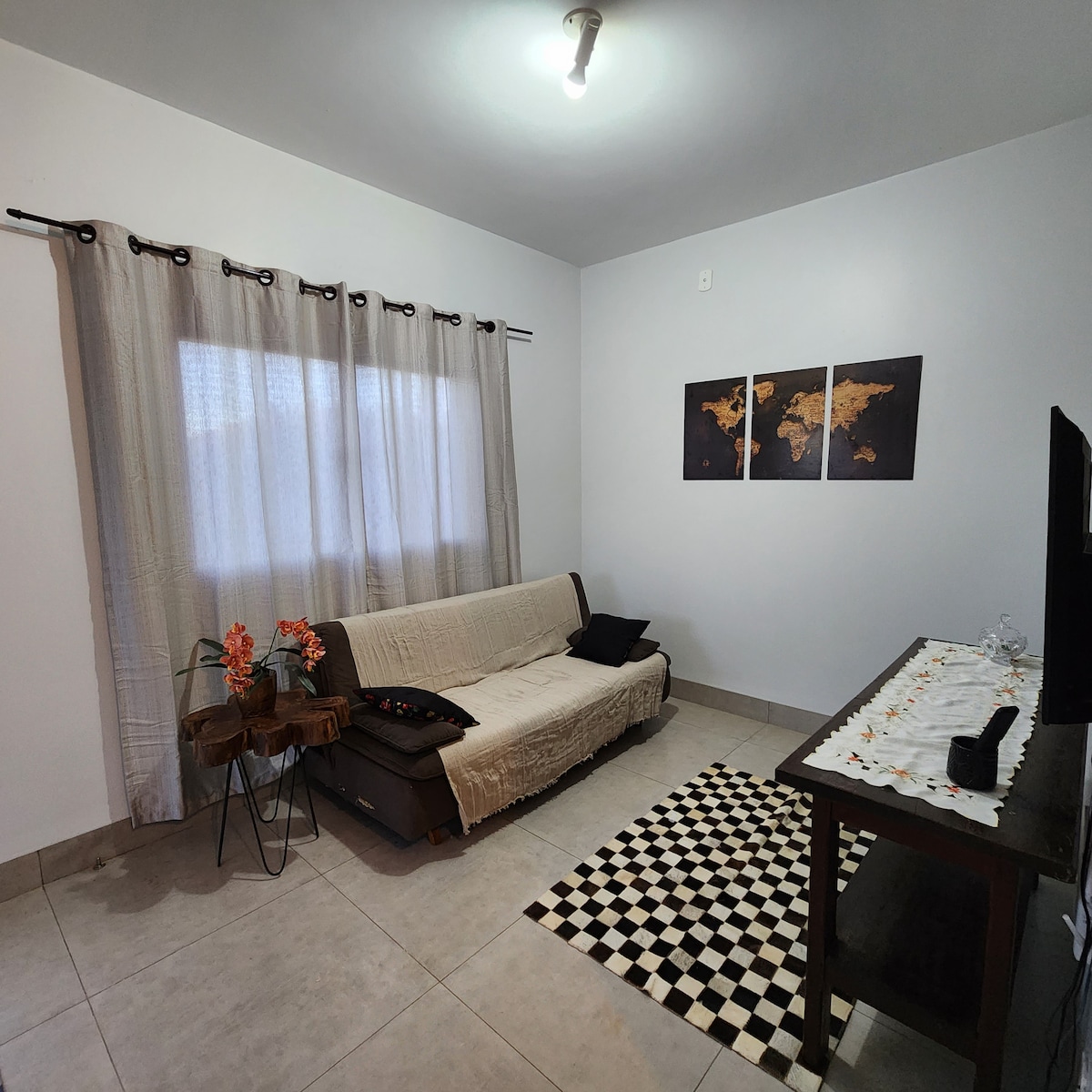 Studio proximo ao centro de Campo Novo do Parecis, ideal para quem vem a trabalho ou está de passagem. Cama de casal, cozinha de apoio, ar-condicionado gela o espaço todo, Wi-Fi e TV. Compacto e bem aproveitado. Decoração fora do padrão: parede teal, madeira e plantas. Limpo e pronto na sua chegada. Check-in independente código do cofre chega antes de você.