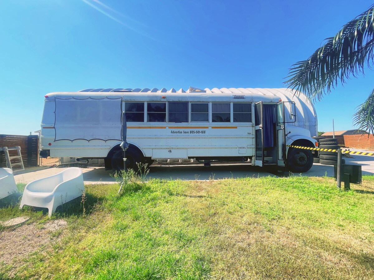 入住由迷人的退役校巴改造而成的舒適多彩露營車。 坐落在寬敞的後院,有高聳的棕櫚樹和盛開的向日葵,你將享受寧靜的鄉村氛圍。 鄰近的農場動物增添了魅力,傍晚在火坑旁邊可欣賞到完美的景觀,讓您放鬆身心。