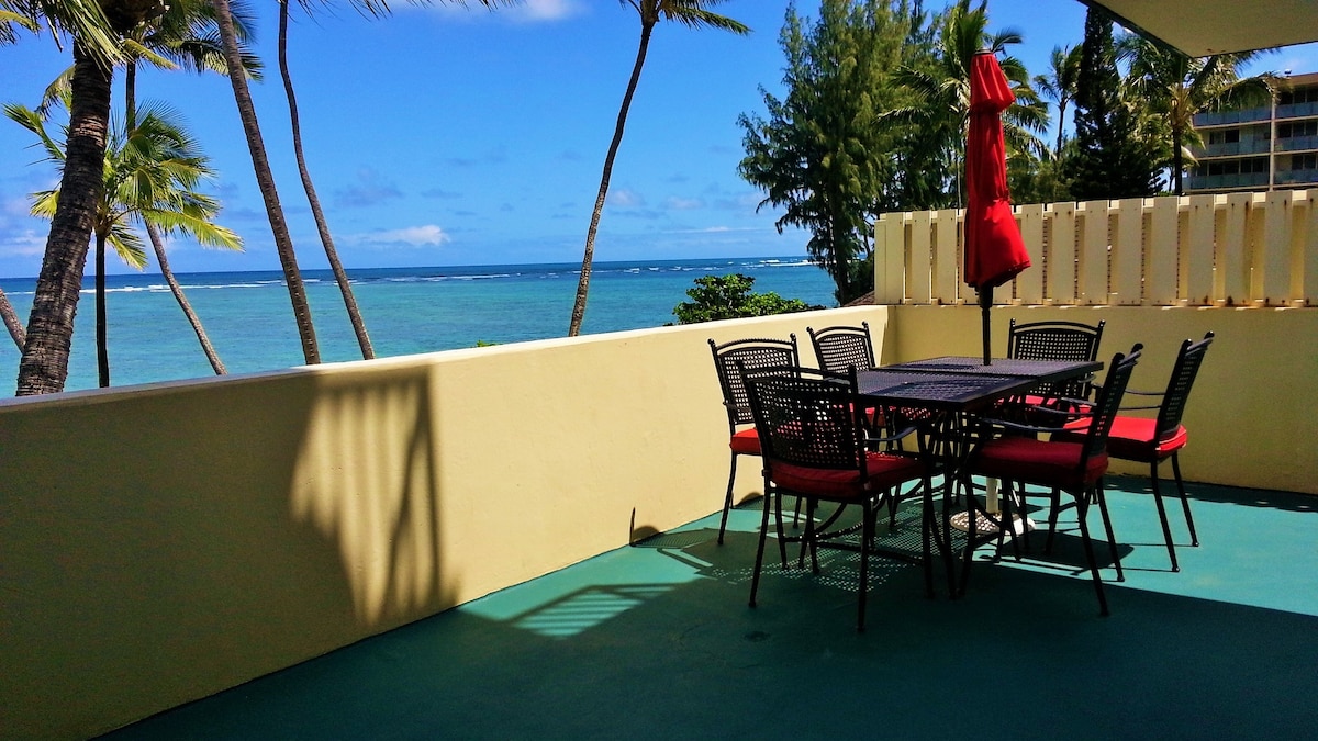 Dream away in this romantic, sandy beachfront cottage. (Not affected by recent rain in Hawaii.) Perfect for couples and families! Enjoy life on the beach, or relaxing on a large patio facing the ocean. This charming cottage features a remodeled galley-style kitchen, and bath. No A/C, but trade winds and ceiling fans keep you comfortable. Price includes all taxes, resort and parking fees. See spectacular sunrises, moonrises, and giant, green-sea turtles sleep on the beach at night until dawn.