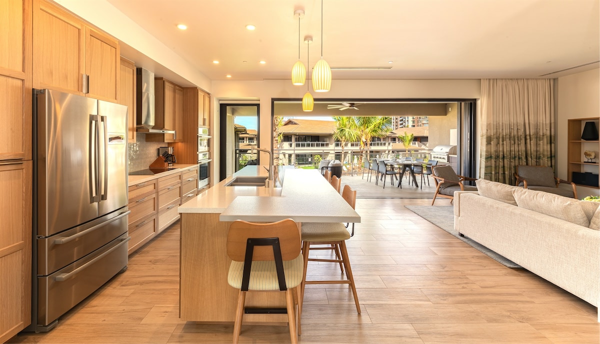 在這個明亮開放的島嶼起居區,與寬敞的陽臺相連,欣賞迷人的全景。 非常適合擁有相連起居和娛樂空間的家庭,但也很安靜和私密,有兩間臥室,每間都有自己的私人露臺和雙梳妝臺浴室。 這是一個非常彈性的空間,為您想要的假期做好準備! Kapalua擁有世界一流的海灘、美麗的景觀和令人驚嘆的活動/設施!