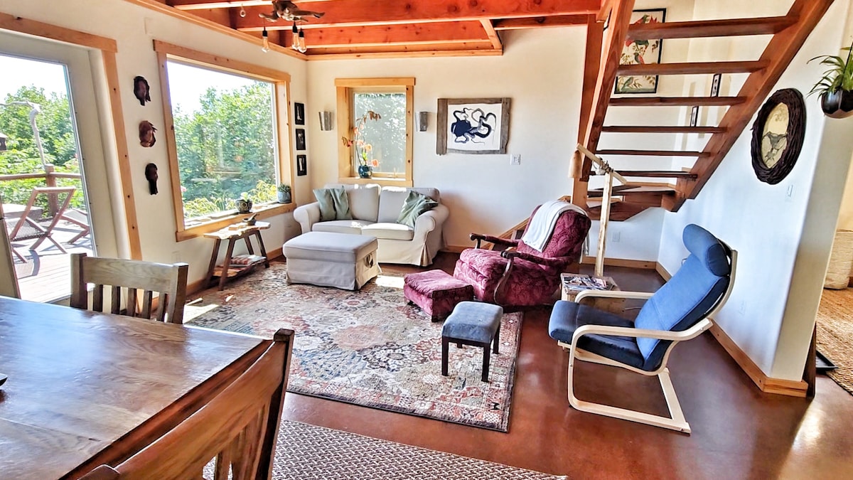 JUST READ THE REVIEWS from our guests! "The Loft" is a gorgeous and very special and unique property. Ranked by AirBNB in the top 1% of homes. Situated on 3 acres located on the downtown Homer hillside, with spectacular views overlooking the Homer Spit, Kachemak Bay, Beluga Lake and more. Surrounded by lush, magical gardens. Enjoy this harmoniously calm, beautiful, and private setting, with spectacular views and gorgeous gardens. Quality, custom interior finishes rival a 5 star hotel.