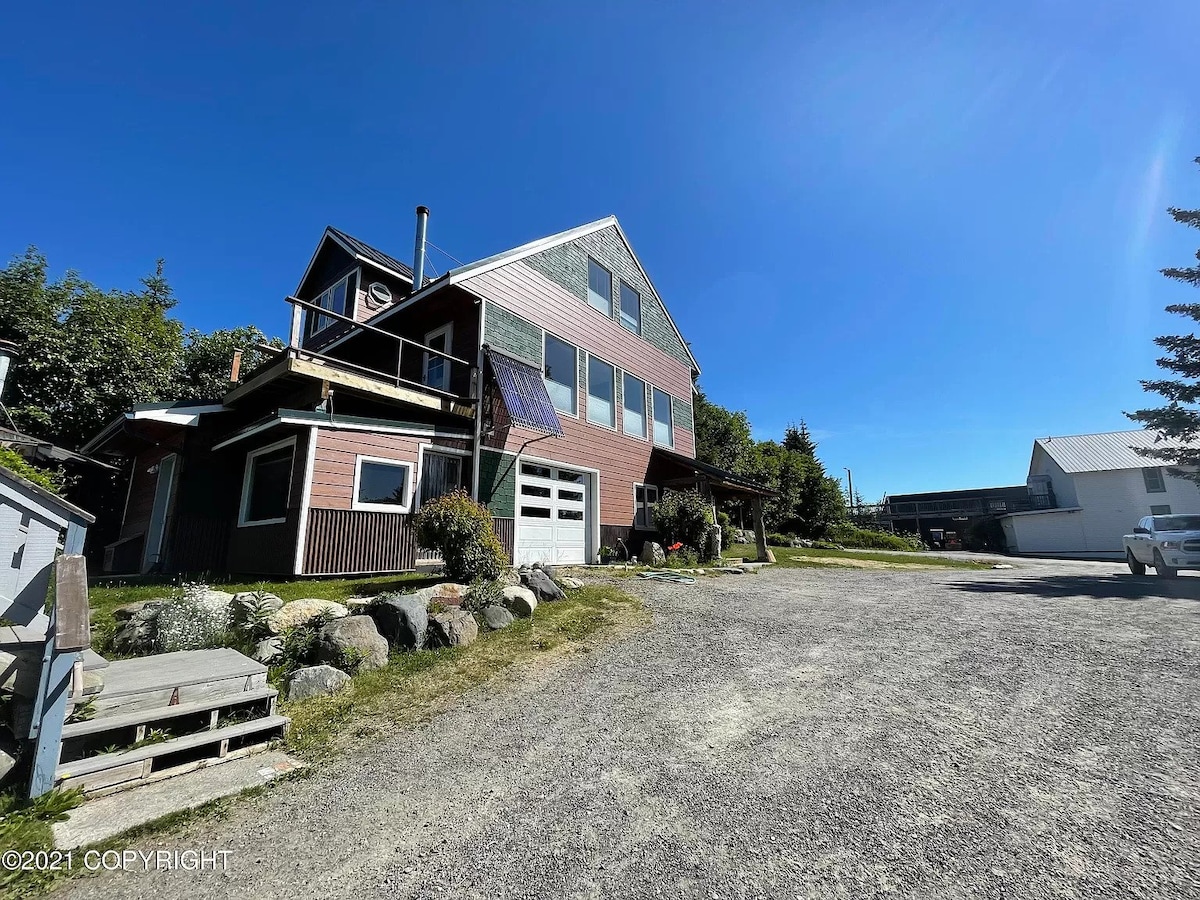 這間美麗的3間臥室房源安靜地坐落在荷馬市中心,可欣賞卡奇馬克灣和基奈山脈的壯麗全景!在按摩浴池中放鬆身心,沉浸在無與倫比的景色中。打開窗戶,聆聽沿著房源流動的小溪。全套洗衣機/烘乾機供您使用、設備齊全的廚房、2.5間浴室和3間獨立臥室。距離荷馬斯皮特(Homer Spit)、荷馬市中心、餐廳和活動僅幾分鐘路程。