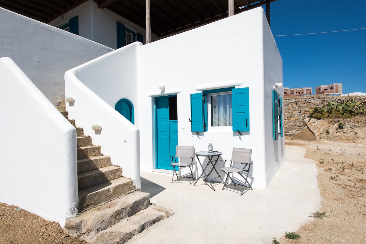 簡單的單間公寓,可供2人入住。對於想在安靜的地區放鬆的人來說,這是完美的位置。大海距離住宅僅200公尺(步行3分鐘)。它有美妙的海景。 我們很樂意接待您入住我們的房源。讓我們根據您有興趣做的事情,協助您在米科諾斯島安排假期。 我們像朋友一樣歡迎房客,並像家人一樣對待他們。