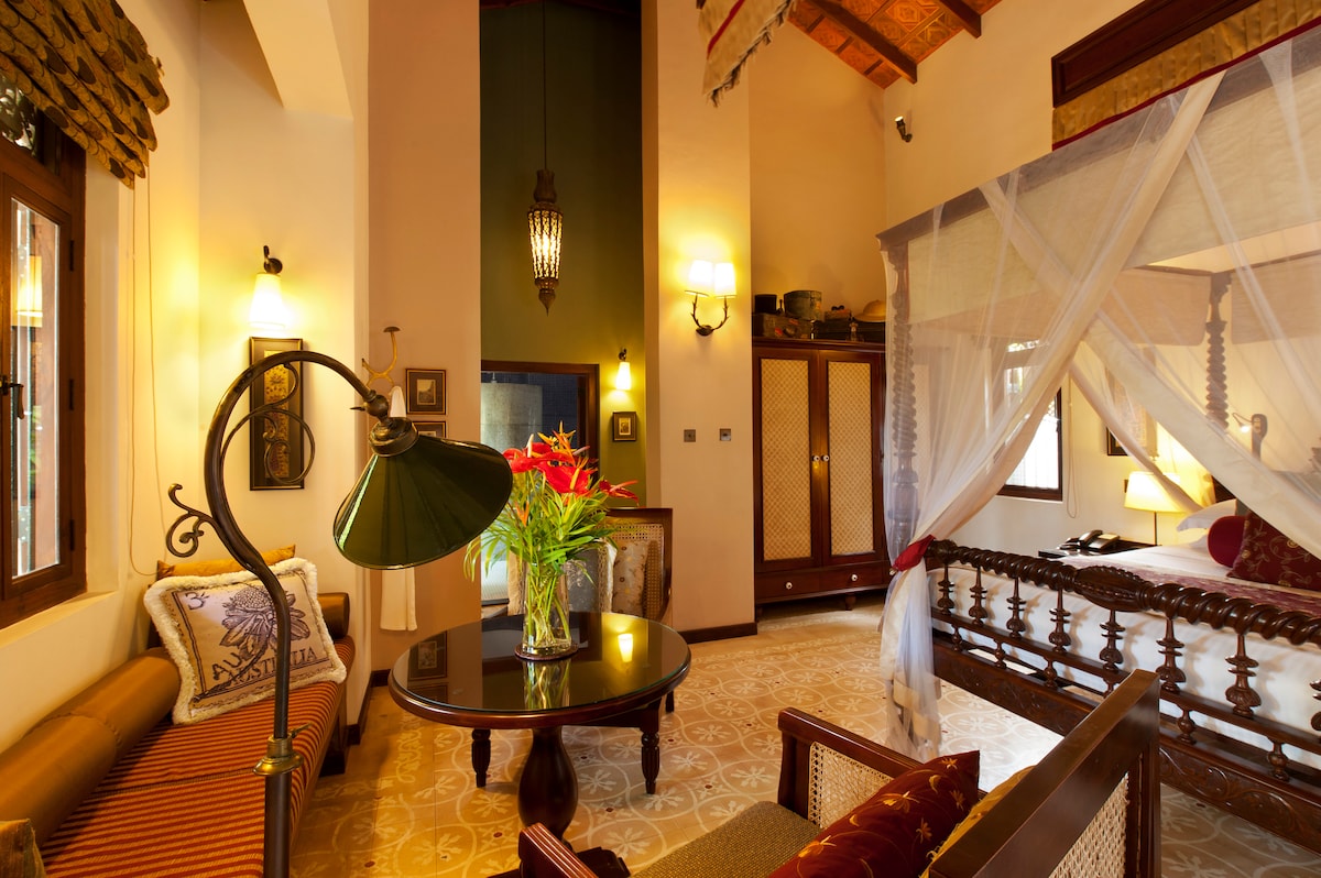 Spacious California king room with private bathroom and bathtub, AC, Smart TV, free Wi-Fi, mini fridge, and full luxury amenities including slippers, towels, shampoo, lotion, dental and shaving kits, loofah, and more. Guests can relax on the verandah or in the living area, enjoy Ayurveda spa sessions and yoga classes in the attic. Just steps from the beach with optional airport pick-up, Sri Lanka tours, and curated meal services.