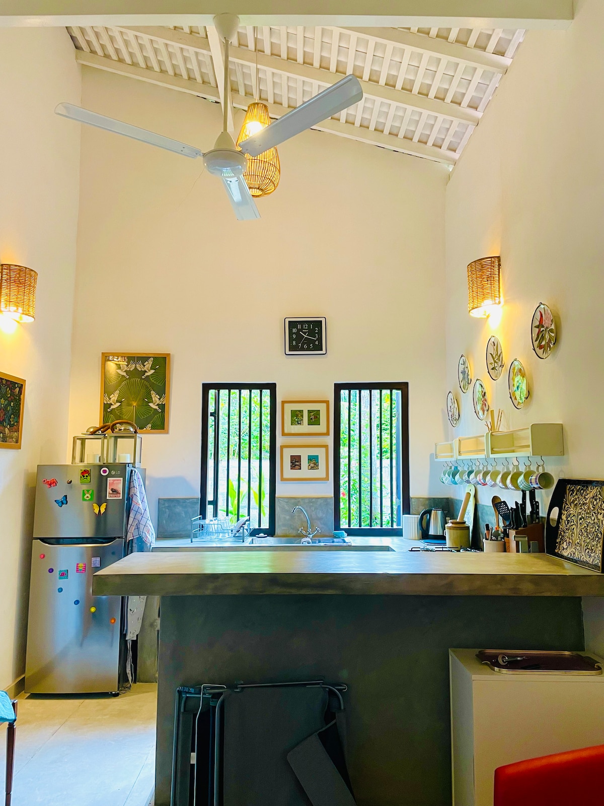 The WE2 " Wildwood Elegance Escape" is a beautifully located private Aframe looking out on to the Induruwa Kaikawala Old Rice Farming Land. Situated at the bottom of a large garden full of fruit and spice trees, the Aframe has a tropical modernist design, built using recycled timber and boasting an Attached Bathroom shower. Breakfast and provided with a smile by the host's family, who are always on hand to help with whatever you need. Birds and lizards abound in the adjoining garden.