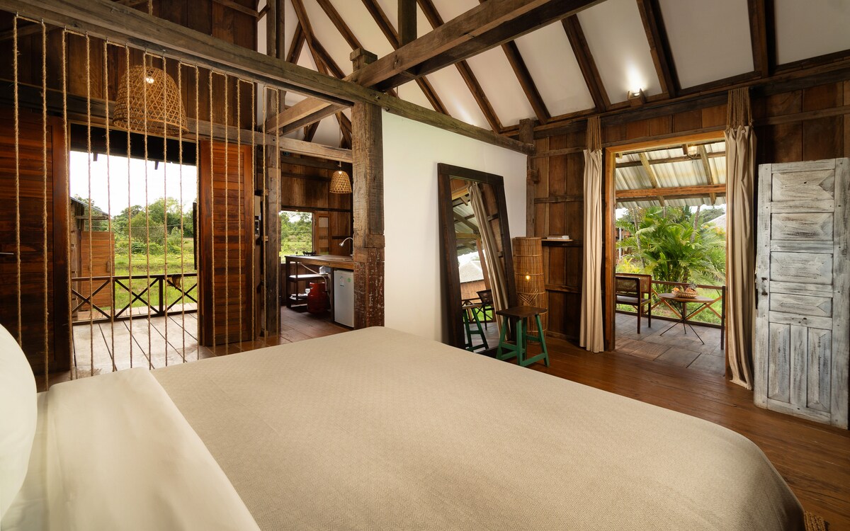 這間小木屋坐落在山腳下,是共用房源的一部分,可欣賞柬埔寨鄉村的美景。 這間單臥室小木屋配有加大雙人牀和套房浴室,配有迷你爐和冰箱,方便您自炊。 您還可以共用建在巖石山上的大型無邊泳池,毗鄰下沉式休息區,有木製座椅、泳池躺椅和雨傘。