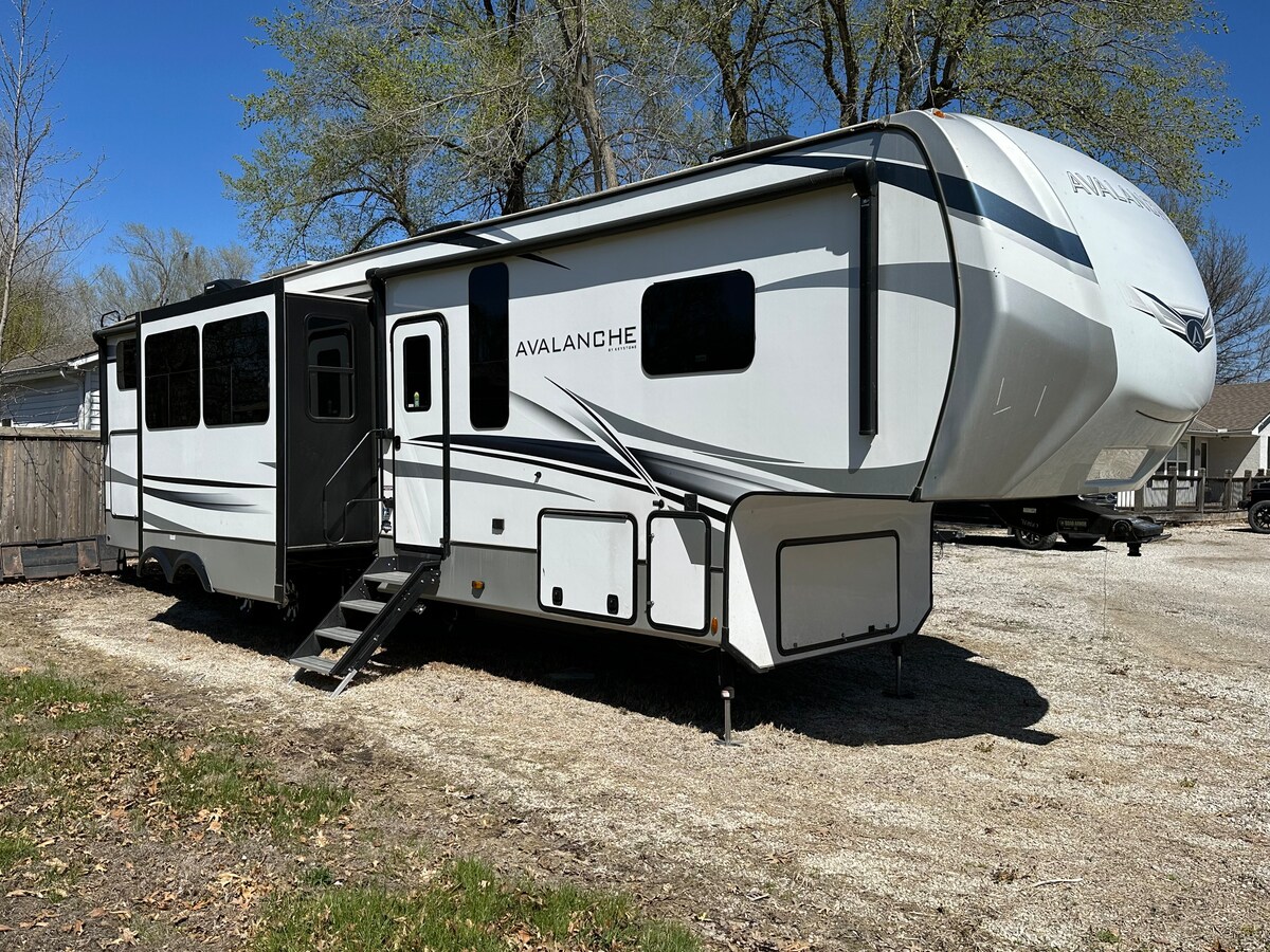 Come stay in this 2020 33 foot Camper/RV! Enjoy the luxury and adventures of camping without having to deal with all of the hassles of maintenance and setting up or tearing down. The camper is stored at my home blocks from downtown Emporia with power and water and sleeps 10. I am able to set it up at any of the nearby campsites for a setup fee. (call for details) Lake Melvern is only 30 miles from my home and I have a large 3 seat Jet Ski at the marina that can also be rented for $350 per day.