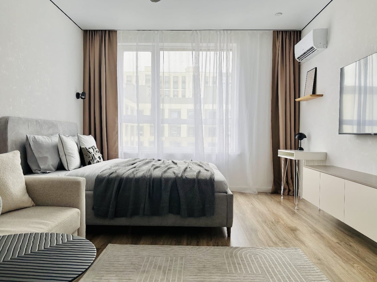 我們在舒適時尚的商業級公寓中等待我們親愛的房客! 全新裝修,配備全新家具和家電( Wi-Fi、智能電視、冰箱、冰箱、微波爐、瓦斯爐、瓦斯爐、錫金、空調、洗衣機)。 請務必清潔、清新、優質的牀單、毛巾。 雙人牀160 * 200釐米,沙發會分成150 * 190釐米的全尺寸牀。 步行即可抵達城市的所有景點!