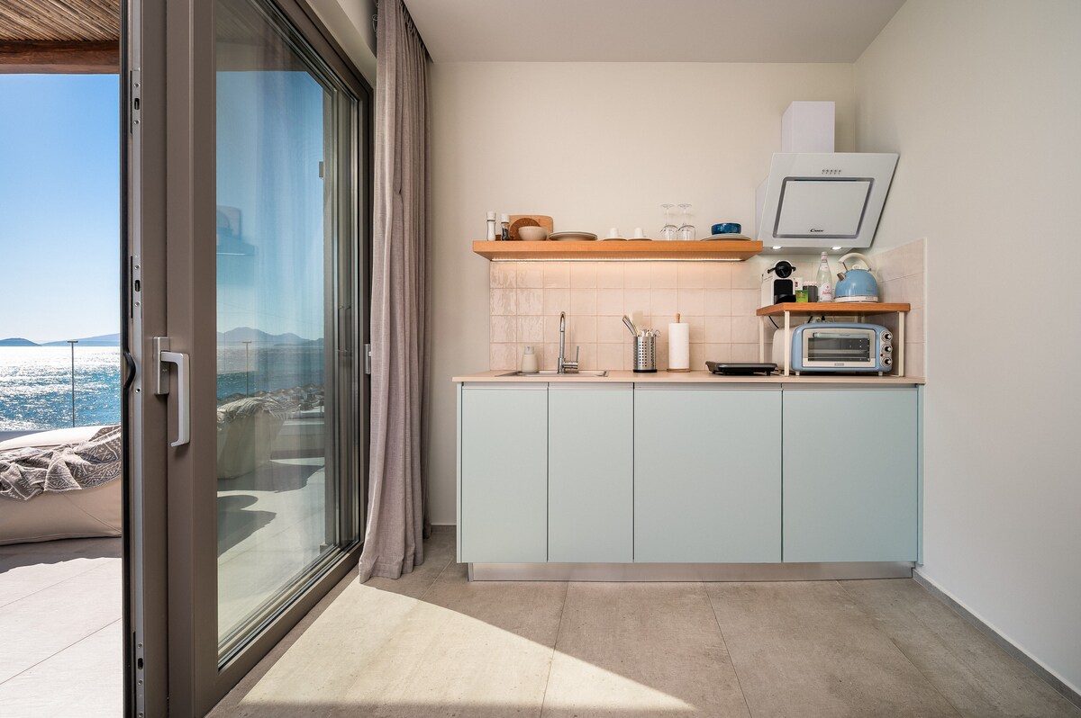 這間新建的套房(28 平方公尺)位於科斯島最美麗的沙灘之一,位於Kardamena,位於海濱房源的頂樓,有一個大型全景海景陽臺(60 平方公尺)。配有Nespresso咖啡機的廚房、配有淋浴間和吹風機的浴室、配有衛星頻道的液晶電視、免費WiFi、獨立中央空調系統和一張加大雙人床。 在我們的海濱套房享受獨特的體驗。