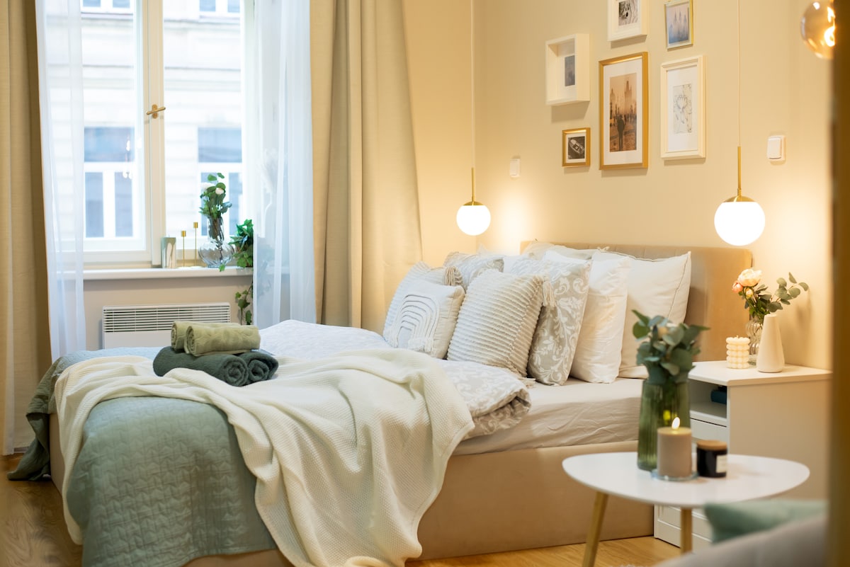 入住我們位於布拉格1區Na Porici街的全新單間公寓!公寓配有電梯、雙人床、智慧電視、設備齊全的廚房和時尚的家具。附近有很多美食熱點,步行即可抵達主要景點!我們不僅為您提供公寓,還為您建立了有用的指南。您永遠不會迷路或挨餓。我們還提供24小時入住服務!