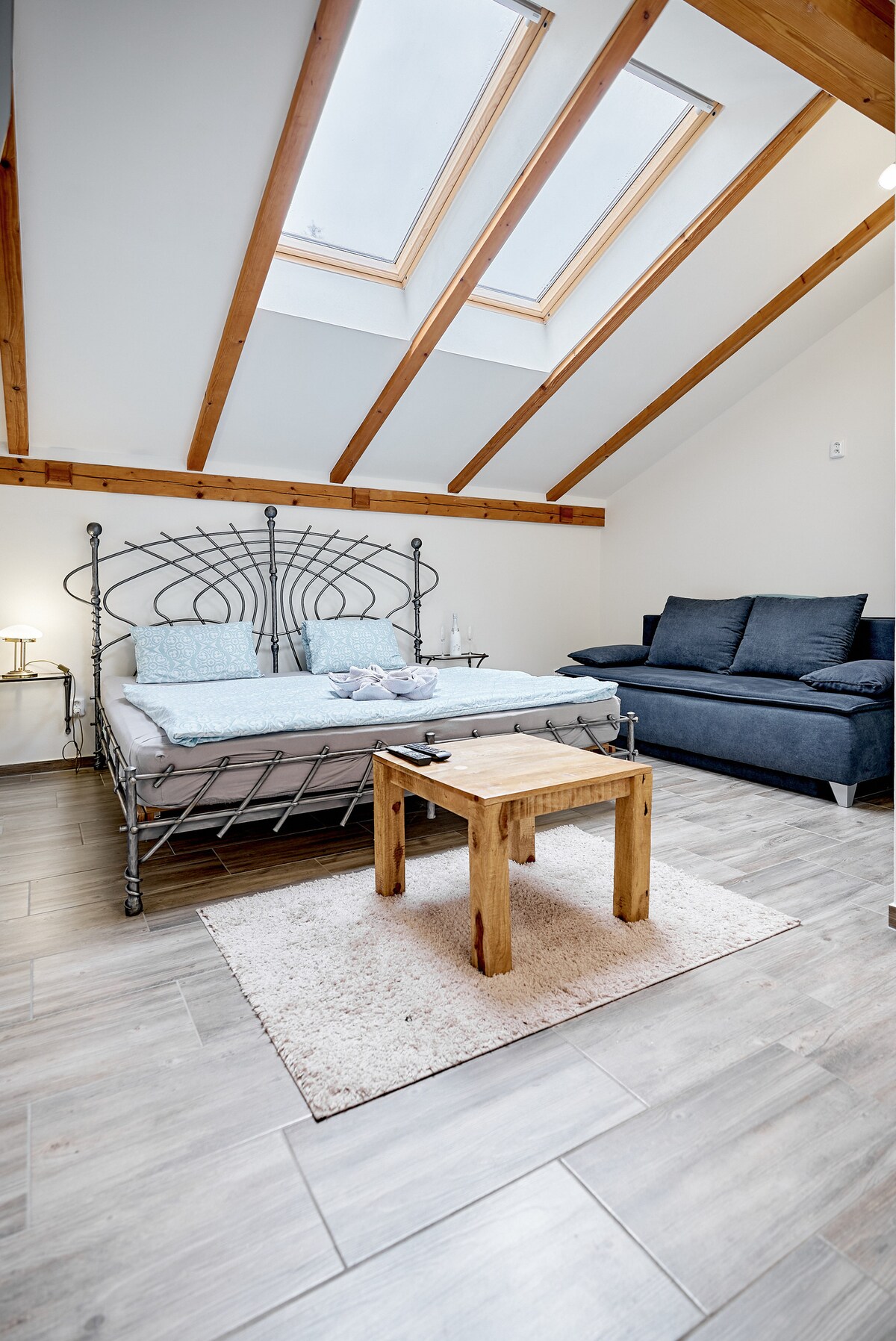 Nově vybudovaný, komfortně zařízený a prostorný apartmán. Ručně kované manželské postele s nočním stolkem Prostorná a rozkládací pohovka (přistýlka pro 2 dospělé osoby) Stolek, komoda, věšák, zrcadlo, sprchový kout (víceúčelová termostatická sprcha), wc a umyvadlo apartmán je podlahově vytápěný a má el. ovládaná střešní okna.