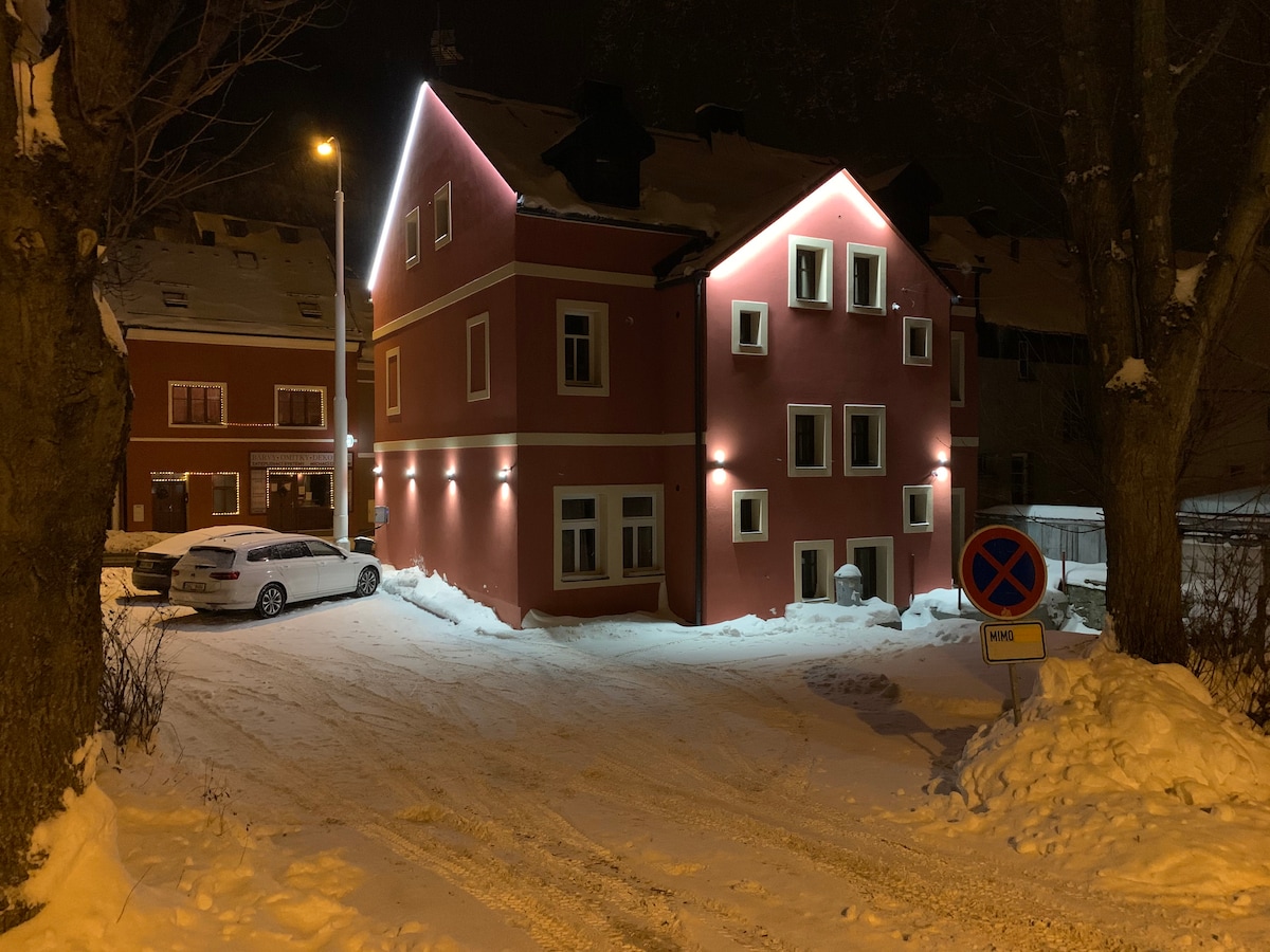 位於中歐最高位置的Boží Dar市中心的舒適單間公寓。 非常適合情侶浪漫或活躍的假期。 公寓距離與Klínovec滑雪度假村相連的Neklid滑雪度假村250公尺步行即可抵達。 在我們全新的公寓中享受您在Boží Dar的假期,真正舒適。 免費WiFi和一輛車的停車位無可挑剔。 公寓房子還提供滑雪和自行車儲藏室。