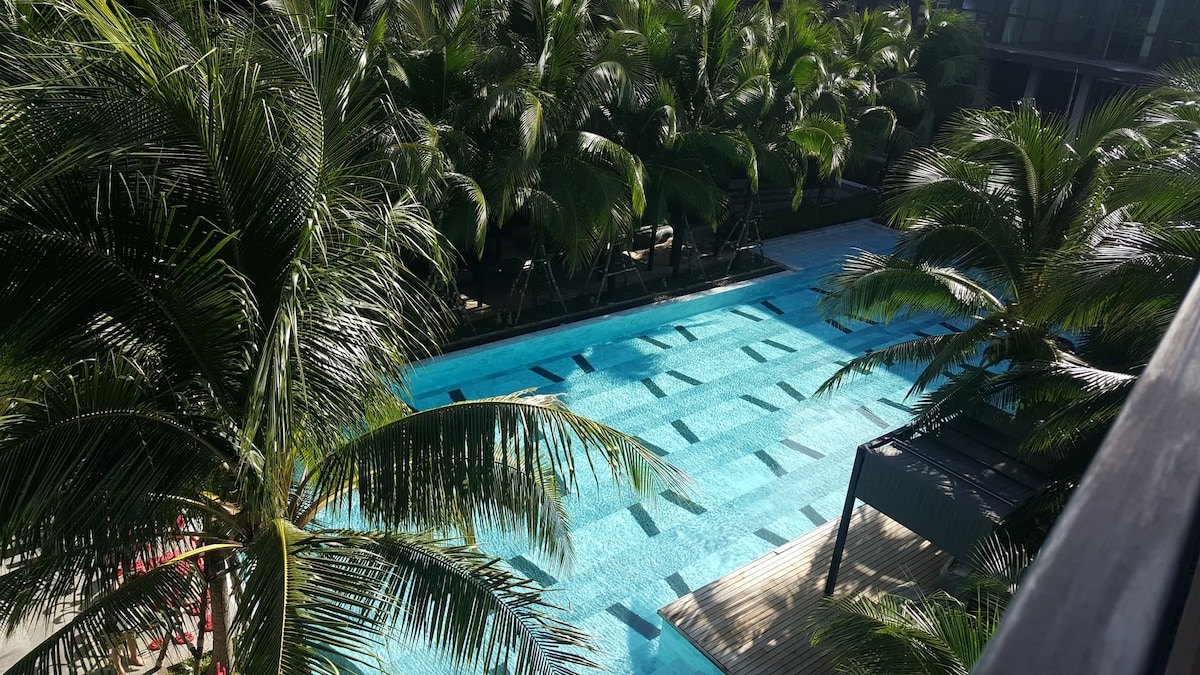 這是一個輕鬆淹水的全景窗戶海灘公寓,享有著名的樹木住宅的最佳景觀。您在度假村的優越位置,靠近前臺和主泳池,但足夠高,有禪意的安靜氣息。 我們提供前往海灘和大街的免費穿梭巴士,以及自行車租賃。 您有24小時接待服務,我們隨時待命。 您可以免費使用4個泳池、桑拿房和2間健身房。 非常安全,有停車位和快速WiFi。 大自然的人們喜歡它。