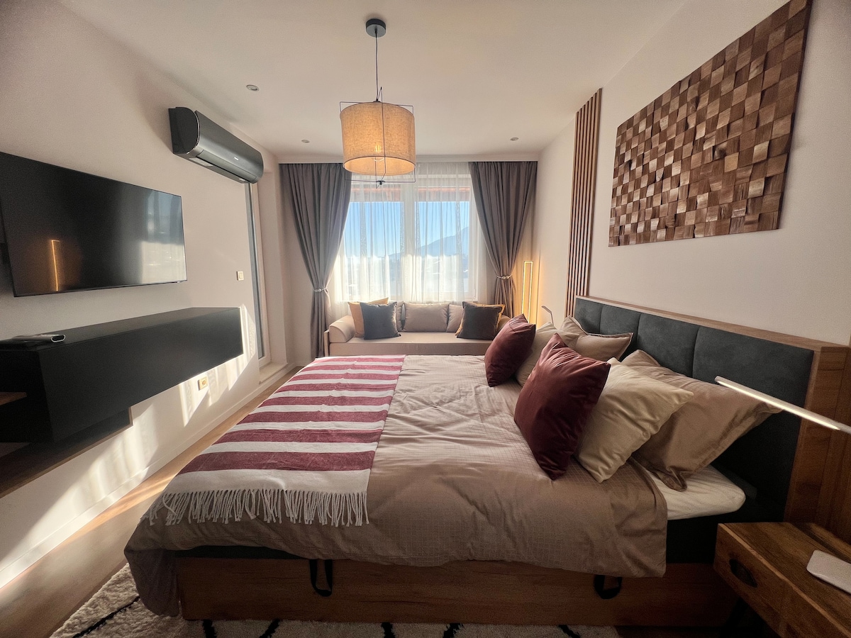 Luxury apartment, situated in the heart of Bansko- on the Main Street, just next to the main ski lift. The apartment is 70m2 and offers the perfect vacation for a family/group of friends up to 4. The apartment: - A big open space living room with fully equipped kitchen, dining table, comfortable and large sofa (full bed option), TV, high speed internet, very nice view of the city and mountains. - Spacious bedroom , with comfortable bed, large wardrobe and TV. - Modern and large bathroom.