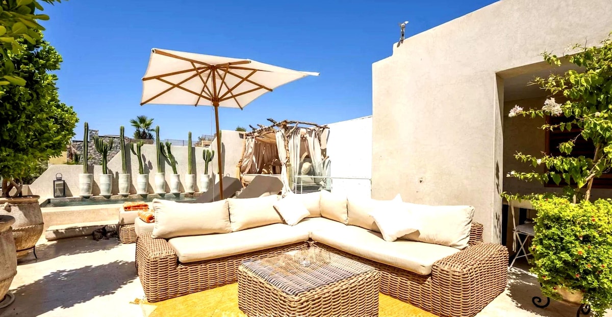 Riad Kasbah Lover,卡斯巴的隱藏寶石。 四間優雅的套房、一個涼爽的私人泳池。 樓上,一個沒有人俯瞰的露台。 距離Jemaa El Fna 10分鐘,美麗的老城區就在你腳下。 Sana會請你享用早餐,並與你分享她的廚房。 您可以隨時聯絡住宿經理Hamza ,讓您的住宿順利。難得的地方,難忘的住宿體驗。 Riad Kasbah Lover是馬拉喀什最美麗、最親密和最活潑的形式。