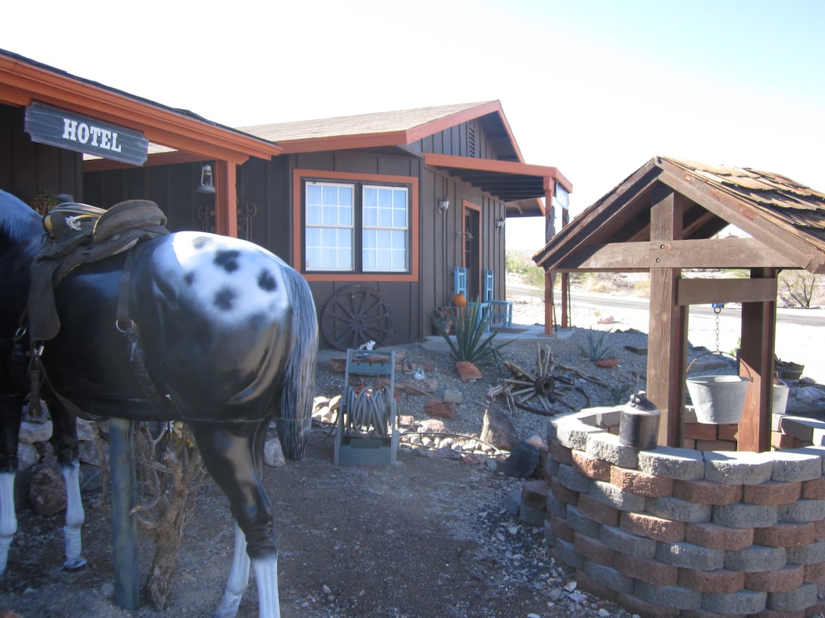 我們的客用住房靠近賭場、河流、湖泊,房源內有一個狂野西部幽靈小鎮,我們距離山區沙漠步道2分鐘,我們位於牛頭市的山區,非常安靜的鄰居,在C&M RANCH安全且風景優美,帶上您的船、露營車或沙漠玩具,我們有很棒的步道騎行、很棒的湖泊和河流以及賭博、用餐等,我們沒有爐子,但我們有大型電煎鍋、雙燃燒器熱板、微波爐和後院的大型丙烷燒烤