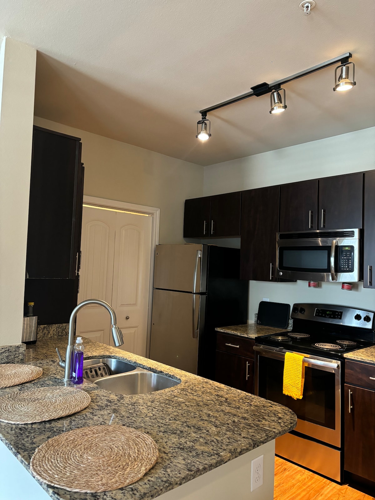 Enjoy the luxury Helix mattress, morning coffee, private balcony, spacious closets, garden tub, and in-home laundry. A pack-n-play is provided and fits well in a private, cozy nook off the living room. Enjoy the pool, grills, clubhouse, business center, and 24-hour gym. **Parking = during business hours you can park inside the gate, but outside of business hours you must park outside the gate, only a 2-minute walk from the apartment.**