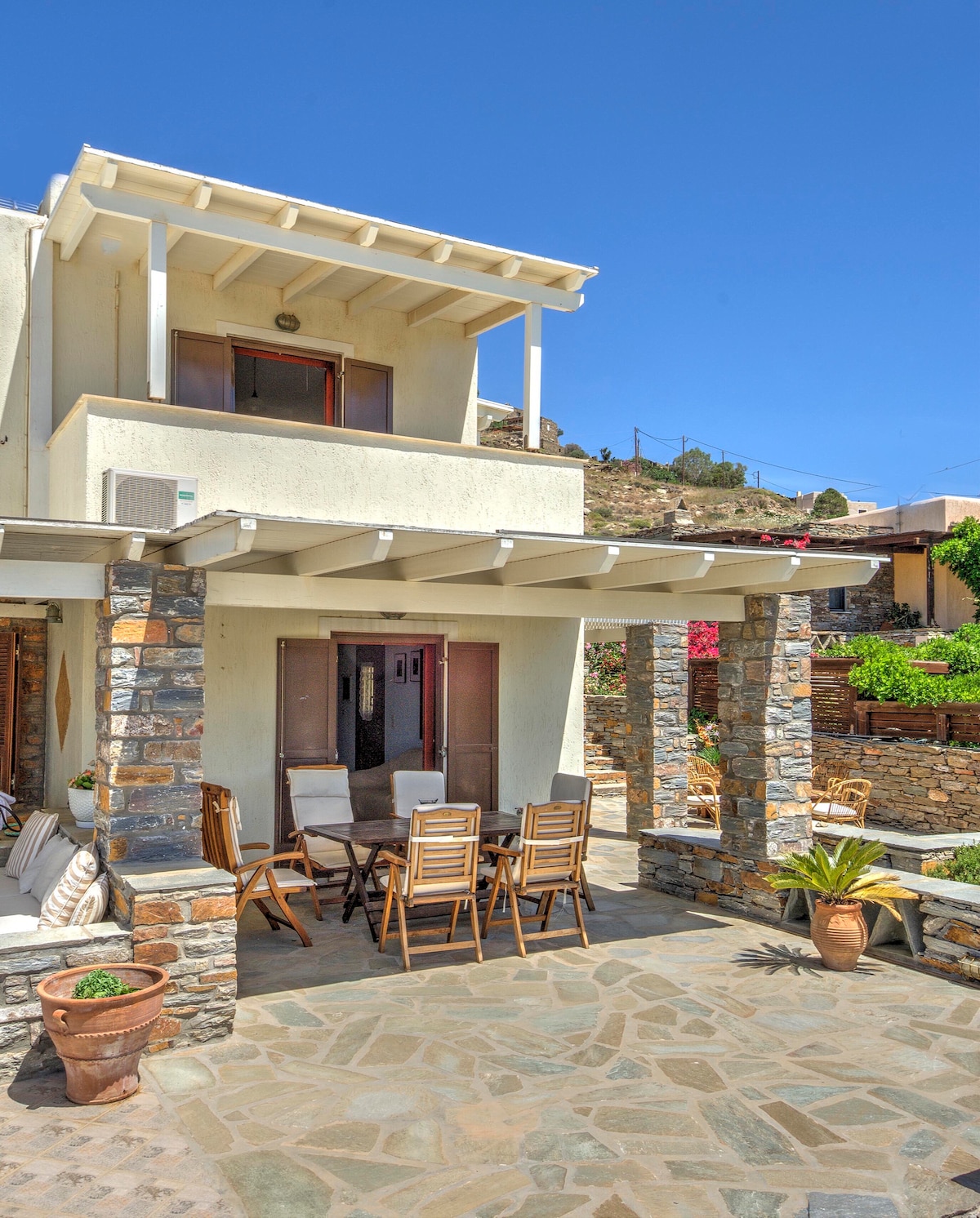 傳統的石屋,佔地4英畝。海拔70米,山頂上有美麗的景觀和安靜,距離國際化的Vourkari和Otzia海灘僅3分鐘路程,距離港口僅6分鐘路程。 整棟房子由3間獨立住宅組成,彼此沒有直接視覺接觸。此頁面積為85平方米和50平方米的陽臺有蓋停車場,設計完美,最多可容納7人。理想的是4