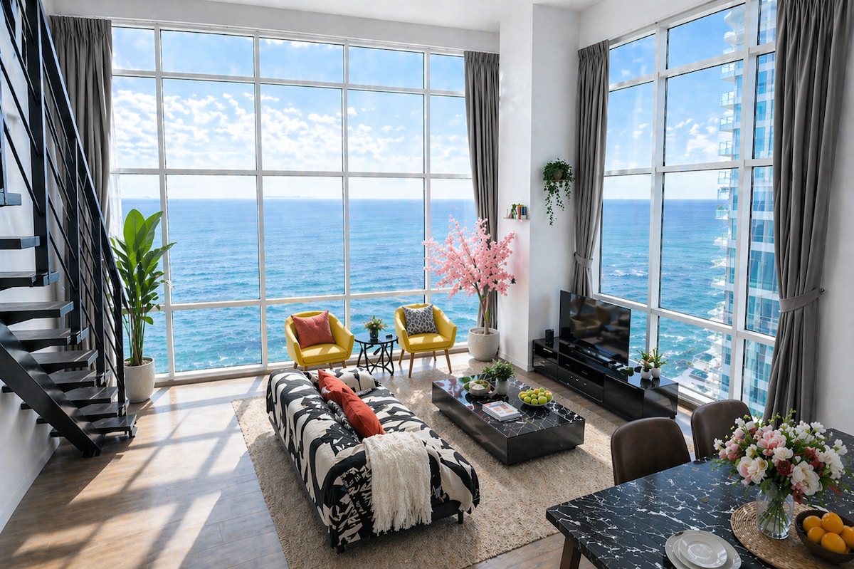 Enjoy a stylish seaview duplex at Maritime Suites, Penang 🌊 This spacious loft features a bright living area with large windows and ocean views, creating a relaxing stay. Perfect for families, friends, or business travelers, with 2 bedrooms & 2 bathrooms for comfort and privacy. 💧 Free water dispenser (purified water) 👶 Baby cot available upon request 🏊♂️ Pool, gym & free parking 📍 Near restaurants, shops, short drive to George Town & Gurney Drive ✨ Comfortable seaview stay in Penang