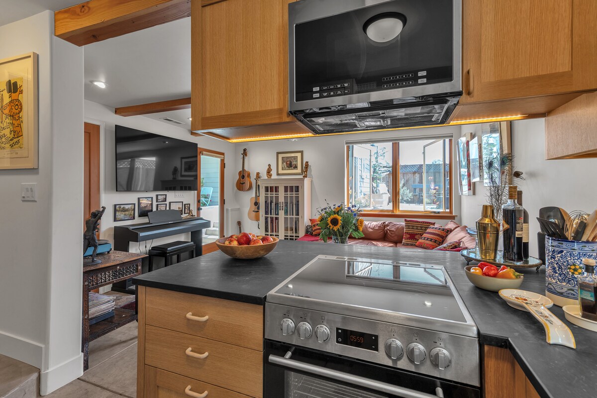 我們最近翻新的歐式單間公寓配有高品質的設計師家具、不拘一格的藝術品和私人露臺。您可以在按摩浴池中浸泡,或在露臺上喝一杯,欣賞舊金山和海灣的壯麗景色。在設備精良的小廚房準備晚餐,並在室內享用一流的 Dimplex 電動壁爐/暖氣。放鬆身心,享受陪伴或在全皮革客廳家具上看電視。我們的天然木質平台床配有Casper記憶泡綿床墊,讓您享受奢華。
