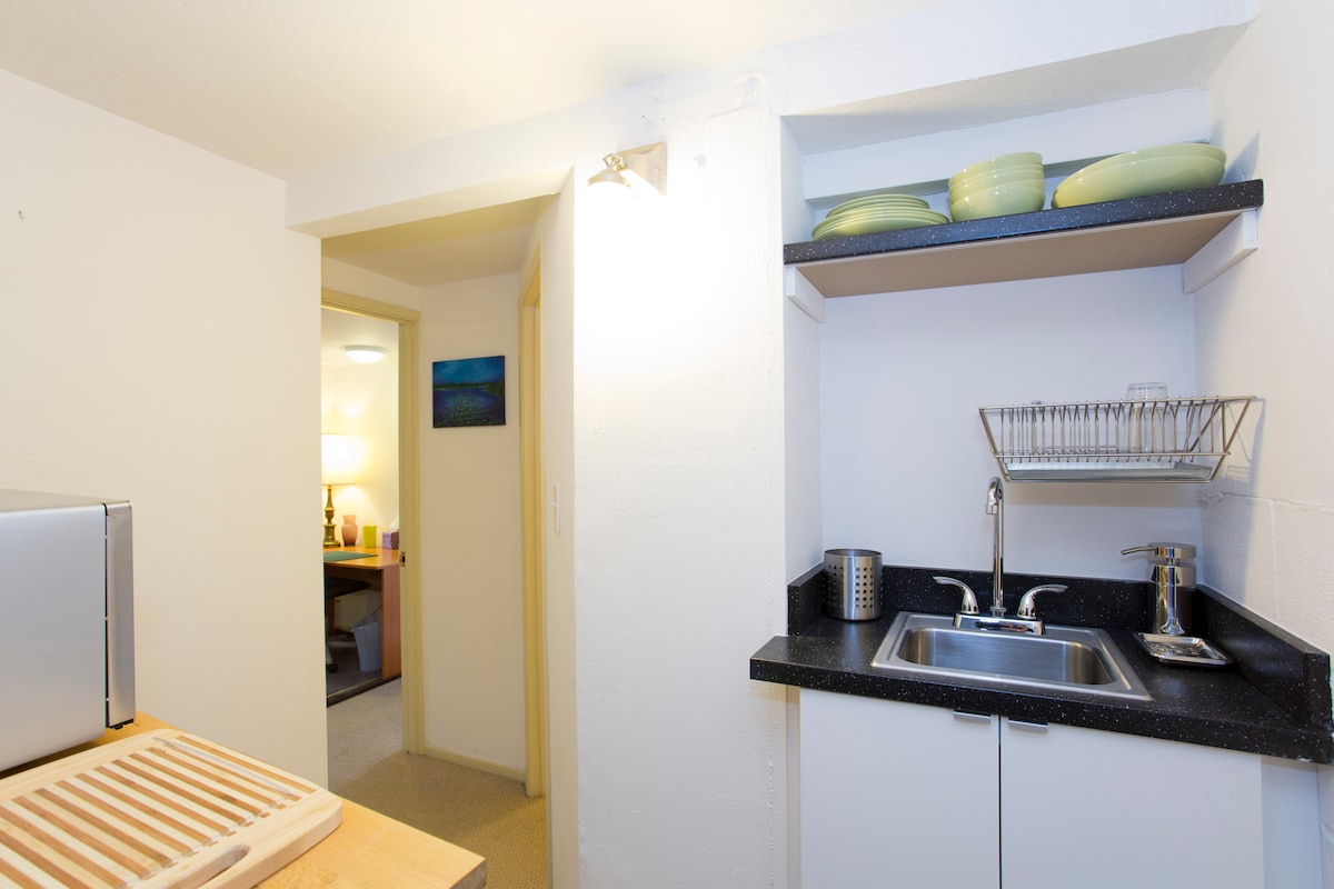 小型私人單間公寓,配有1.8公尺寬雙人床,位於1928年北伯克利的優雅房源內。步行即可抵達 Chez Panisse 和「美食貧民窟」。靠近交通工具。獨立入口、衛浴和小廚房。包括美味點心和WiFi。禁止貓。 伯克利市區號:ZCSTR2O18-OO33